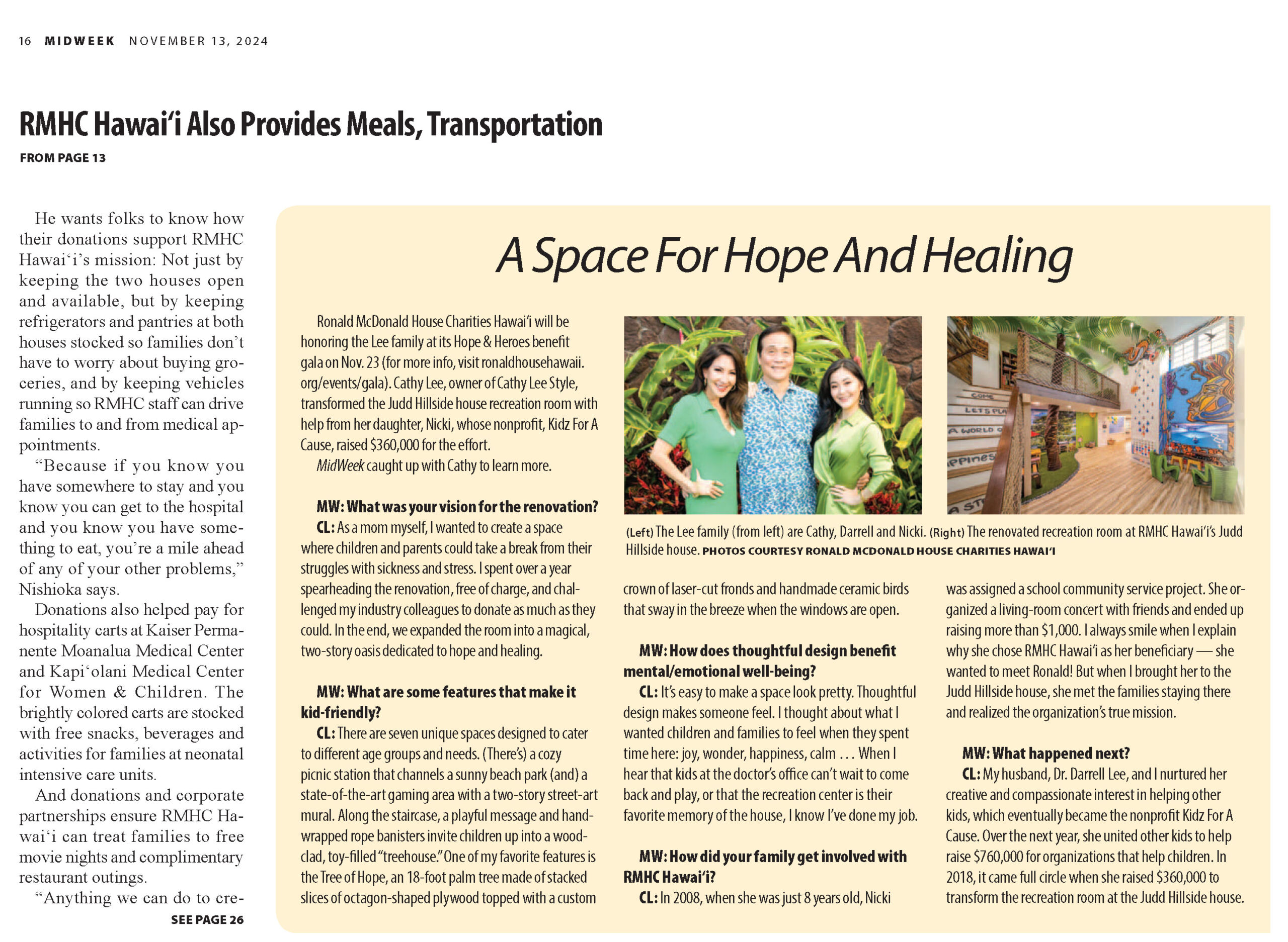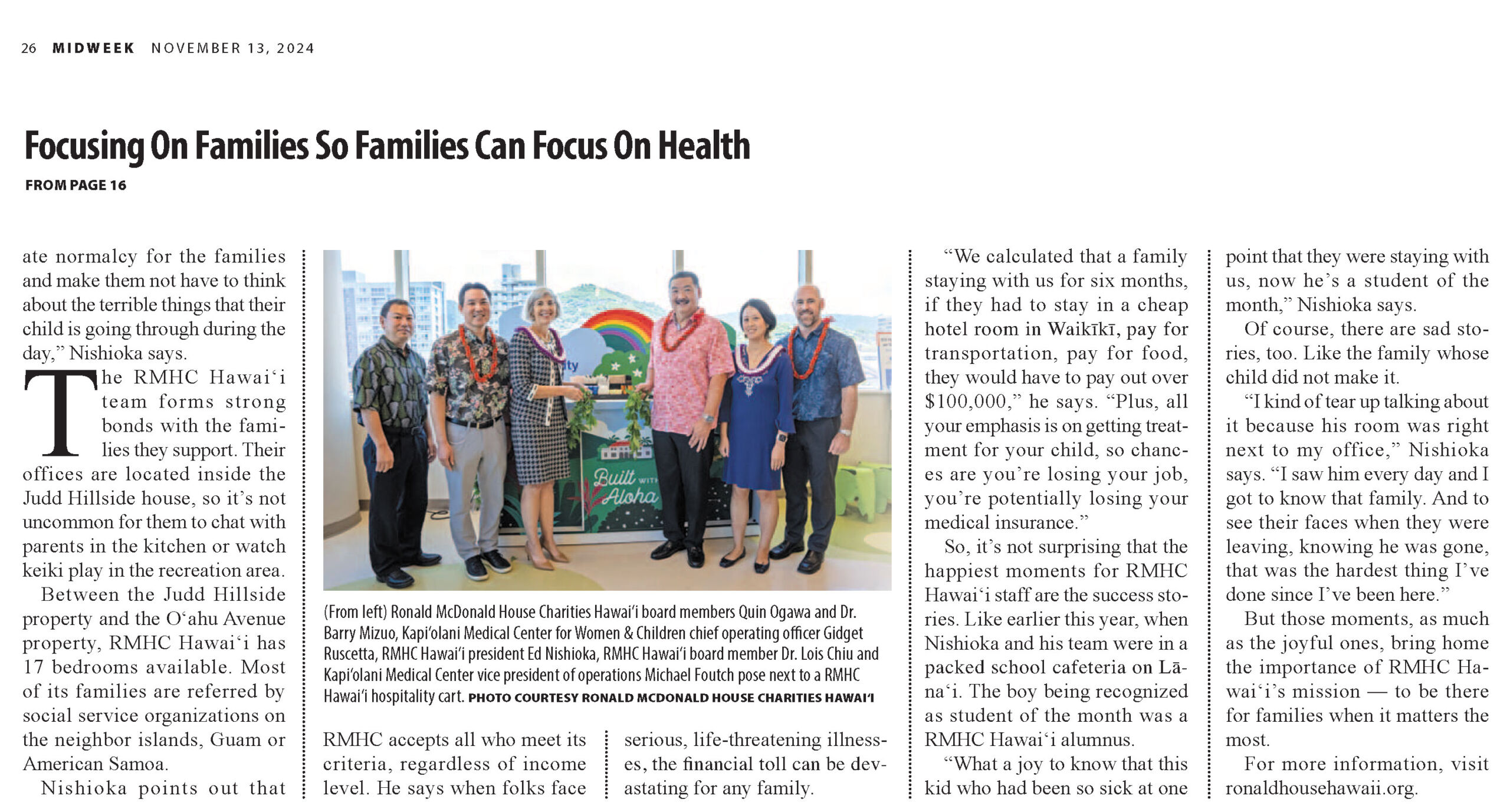 Ronald McDonald House Charities Hawaii was featured as a Cover Story in the November 13th, 2024 edition of the MidWeek. To check out the story, which details the different kinds of service we provides families, visit. Midweek’s “Home Away From Home” cover story.