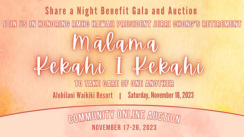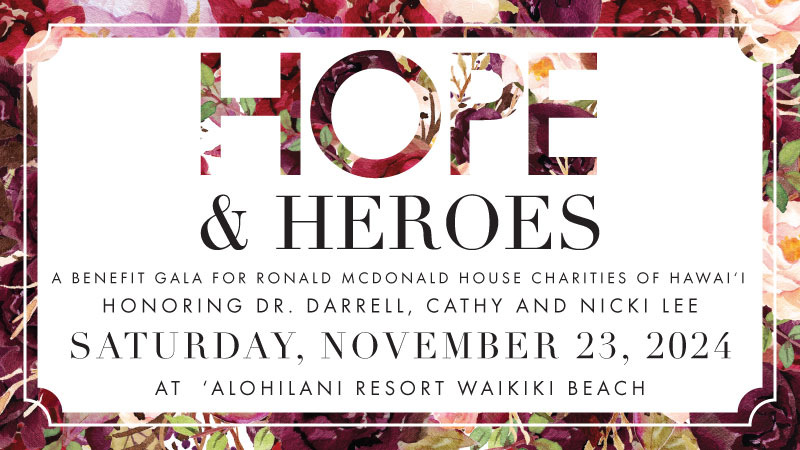 © 2024 RMHC Hawaii. The following trademarks used herein are owned by McDonald’s Corporation and its affiliates; McDonald’s, Ronald McDonald House Charities, Ronald McDonald House Charities Logo, RMHC, Ronald McDonald House, Ronald McDonald Family Room and Ronald McDonald Care Mobile.