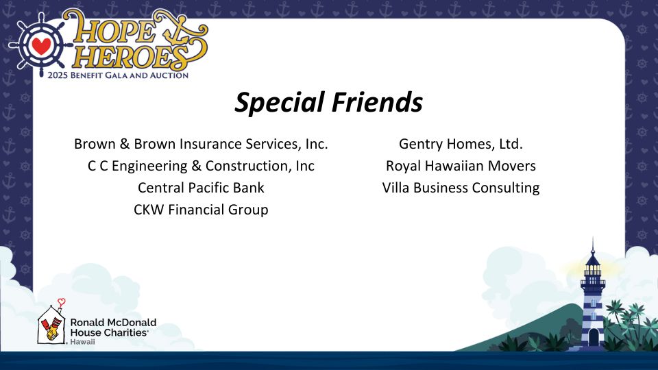 On Saturday, November 22, at the Alohilani Resort Waikiki Beach, we held our 2025 Hope & Heroes Benefit Gala! Guests joined us for our nautical-inspired evening of celebration, food, auction treasures, and unforgettable Yacht Rock entertainment featuring the Tris Imboden Yacht Stars!