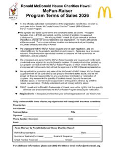 - Payment must be made with school or organization check, cashier’s check, exact cash or money order payable to Ronald McDonald House Charities Hawaii.